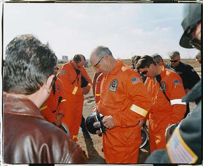 | Before the firefighter start to extinguish burning oil fields, they always pray together. «We’re very close because we all believe in God», says one. The local pastor of Elk City is planing to travel with them to Iraq. Elk City, Oklahoma, USA 02.2003 |