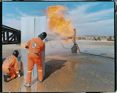 | Two firefighters are supervising the cutting device that is used to cut the destroyed head of the burning oil well. They are wearing fire resisting clothes, steel helmets and face protection. Aluminum shield sare absorbing heat. Elk City, Oklahoma, USA 02.2003 |