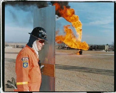 Chris Carson protects himself with a aluminium shield from the heat of a burning oil well. Elk City, Oklahoma, 02.2003