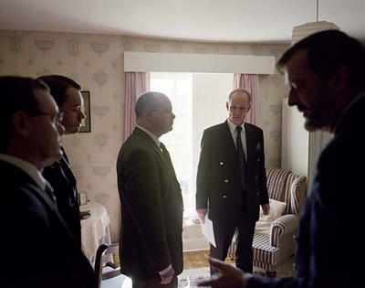 Robert Watson (right) explains how to arrange the room for guests. from left - right: Robert McDermott, Thomas Mark, Declan Travers, Brian Holland-Rose. Butler School, Kempsford, Great Britain, March 2003