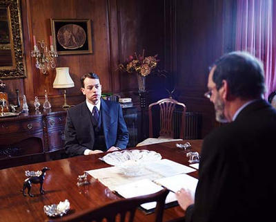Training for job interview. Robert Watson (teacher right), Thomas Mark. Butler School, Kempsford, Great Britain, March 2003