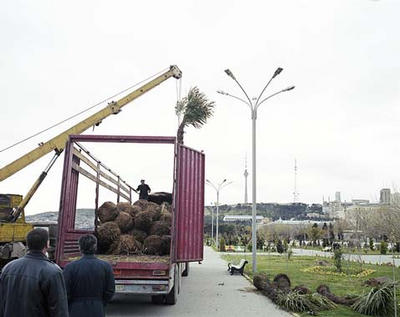 For the celebration of the 80th birthday of president Heydar Aliyev, the boulevard is being rebuilt. Palm Trees from Iran are unloaded. Baku, Azerbaijan, 04/2003