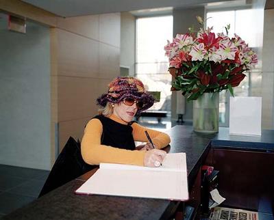 "High Voltage" (so she calls herself), signing in to visit her friend. New York, USA 2003