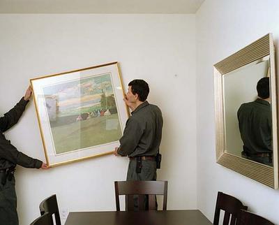 Handymen hanging up pictures for a tenant. New York, USA 2003