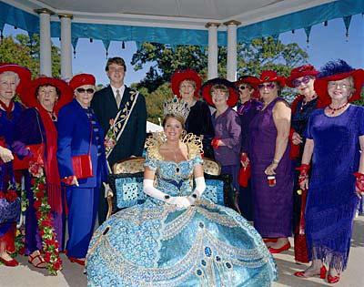 Texas Rose Festival in Tyler Texas. At the Queen's Tea: The Queen Lauren French Sanford and her escort Zachary Edward Lee Willens, posing with women of the “Red Hat Society” (Women over 50).