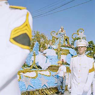 | Texas Rose Festival in Tyler Texas. Queen Lauren French Sanford and her Royal Attendants: train bearers and sceptor bearer on their float at the Rose Parade. Accompanied by the Ross Volunteer Company from Texas A&M University, the oldest student organization in the state, is an honor company composed of junior and senior cadets. The unit is the official honor guard for the Governor of Texas and marches in major parades. |
