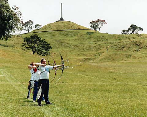One tree hill domain, at Auckland Archery Club Obelisk on top Pohutukawa (red tree) nz christmas tree - flourishes during christmas time. Auckland, New Zealand, 12.2001