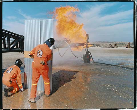 Two firefighters are supervising the cutting device that is used to cut the destroyed head of the burning oil well. They are wearing fire resisting clothes, steel helmets and face protection. Aluminum shield sare absorbing heat. Elk City, Oklahoma, USA 02.2003
