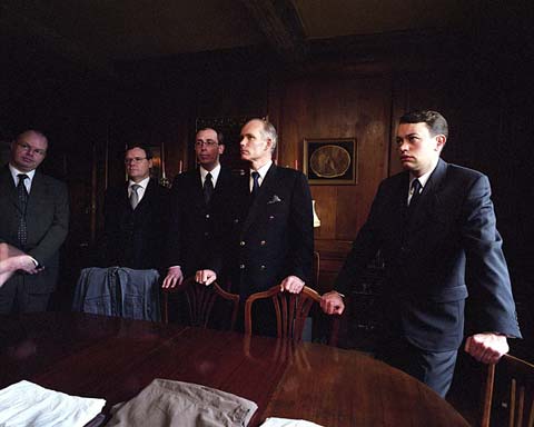 Robert Watson explains the folding of clothes. From left - right: Declan Travers, Robert McDermott, Shaun Bresnihan, Brian Holland-Rose, Thomas Mark. Butler School, Kempsford, Great Britain, March 2003