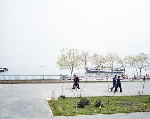 Boulevard at the bay of Baku. In the background a boat that cruises the bay every 30 minutes. Baku, Azerbaijan, 04/2003