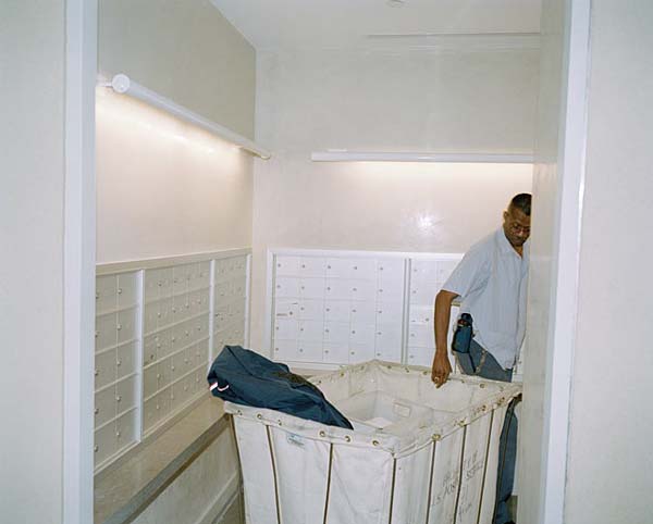 Postman in the mailing room, delivering the daily mail. New York, USA 2003
